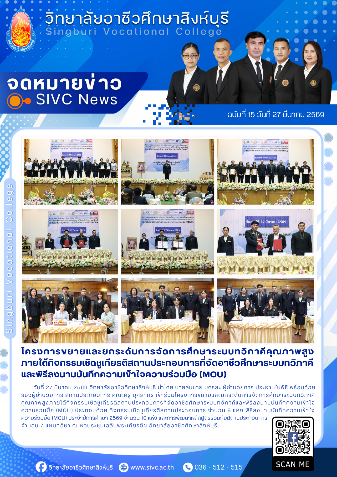 ฉบับที่ 15 (27/03/69) โครงการขยายและยกระดับการจัดการศึกษาระบบทวิภาคีคุณภาพสูง ภายใต้กิจกรรมเชิดชูเกียรติสถานประกอบการที่จัดอาชีวศึกษาระบบทวิภาคี และพิธีลงนามบันทึกความเข้าใจความร่วมมือ (MOU) 2 เม.ย. 2569นฤมล แสงหงษ์จดหมายข่าว Post Views: 3