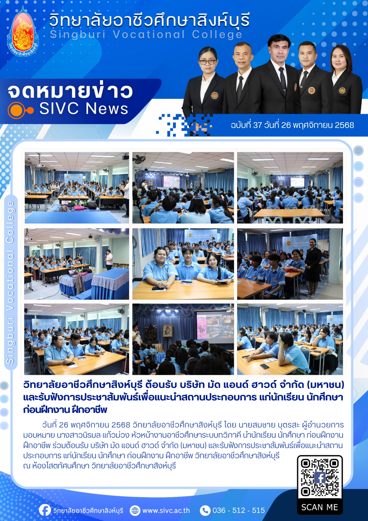 ฉบับที่37(26/11/68)#วิทยาลัยอาชีวศึกษาสิงห์บุรี ต้อนรับ บริษัท มัด แอนด์ ฮาวด์ จำกัด (มหาชน) และรับฟังการประชาสัมพันธ์เพื่อแนะนำสถานประกอบการ แก่นักเรียน นักศึกาา ก่อนฝึกงาน ฝึกอาชีพ 26 พ.ย. 25682 ธ.ค. 2025ratchakarn7จดหมายข่าว Post Views: 1