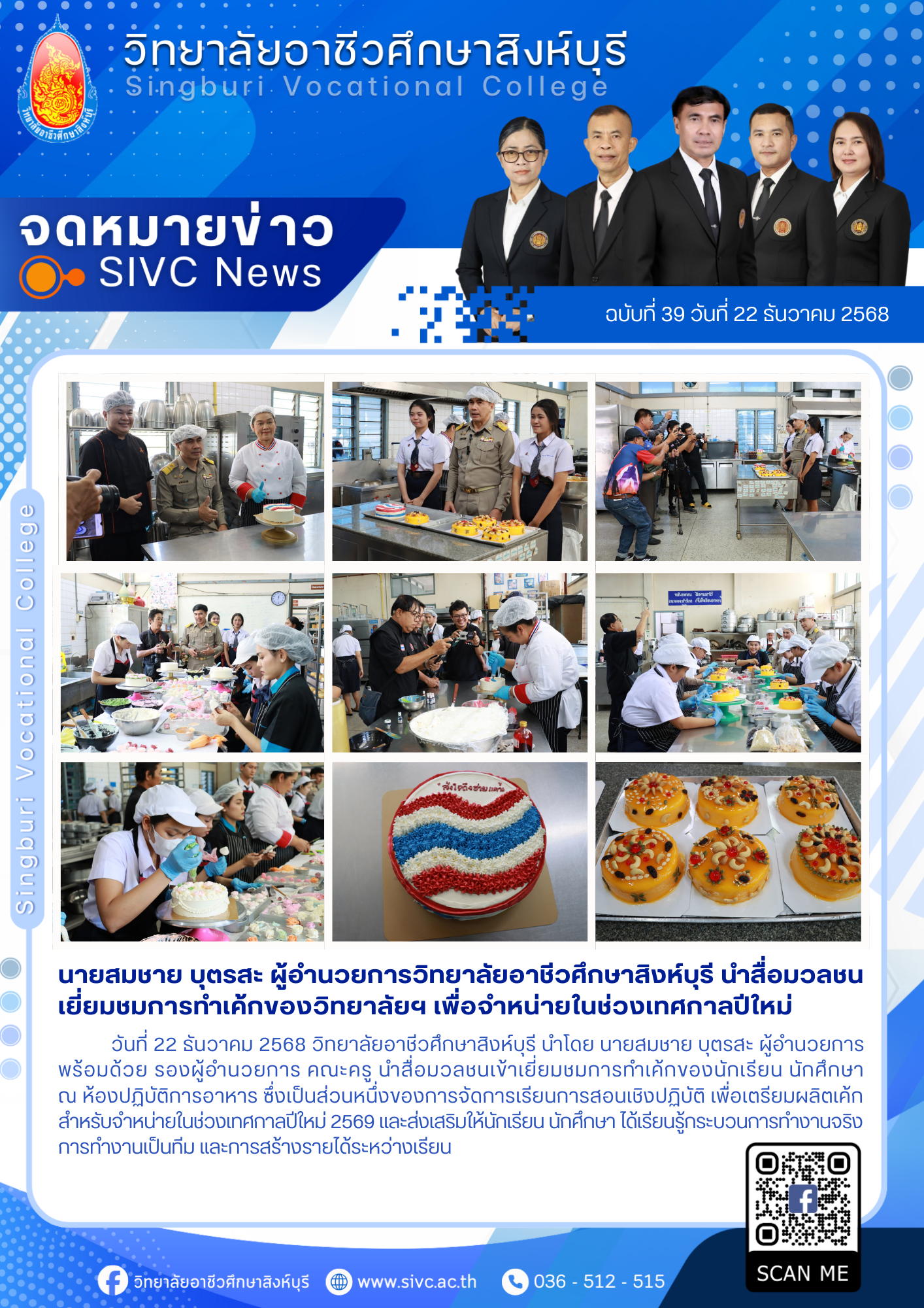ฉบับที่39(22/12/68)นายสมชาย บุตรสะ ผู้อำนวยการวิทยาลัยอาชีวศึกษาสิงห์บุรี นำสื่อมวลชนเยี่ยมชมการทำเค้กของวิทยาลัยฯ เพื่อจำหน่ายในช่วงเทศกาลปีใหม่ 26 ธ.ค. 256826 ธ.ค. 2025นฤมล แสงหงษ์จดหมายข่าว Post Views: 4