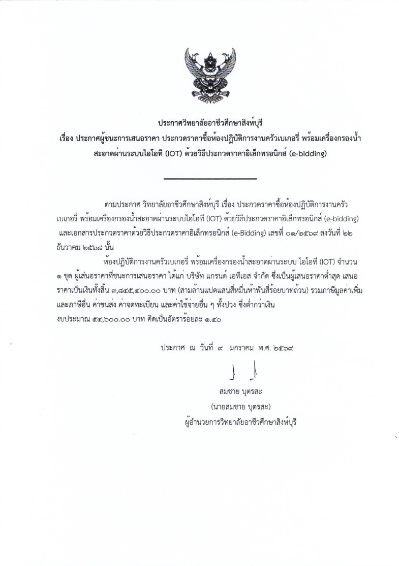 ประกาศ เรื่อง ประกาศผู้ชนะการเสนอราคา ประกวดราคาซื้อห้องปฏิบัติการงานครัวเบเกอรี่ พร้อมเครื่องกรองน้ำสะอาดผ่านระบบไอโอที(IOT) ด้วยวิธีประกวดราคาอิเล็กทรอนิกส์ (e-bidding) 9 ม.ค. 256912 ม.ค. 2026ratchakarn7ข่าวจัดซื้อจัดจ้าง Post Views: 6