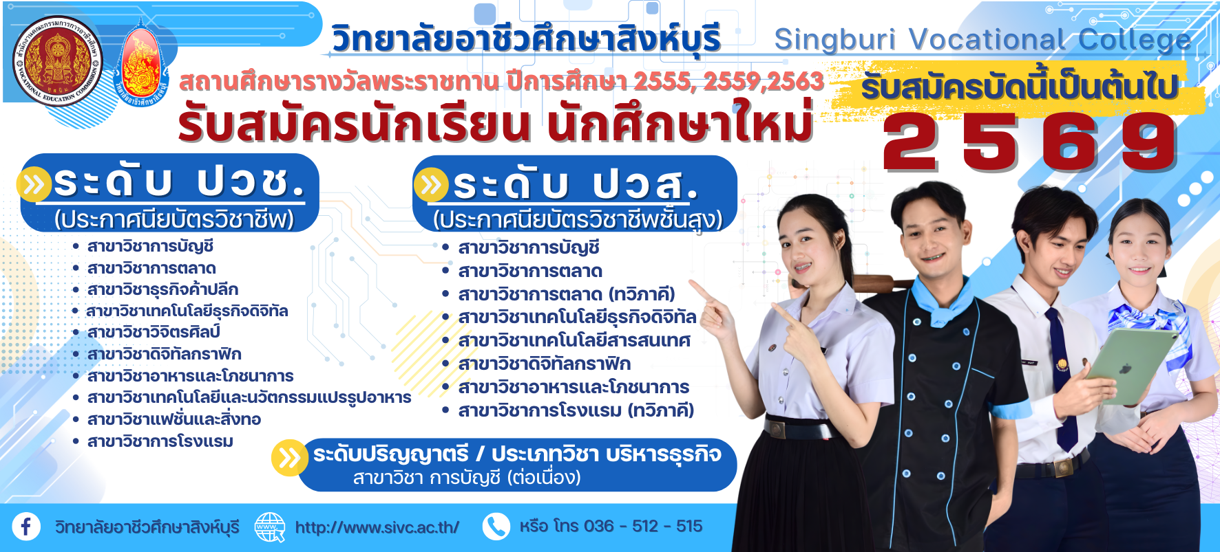 ประกาศรับสมัครทางเว็บไซต์ หรือกดติดตามเพจFacebook งานประชาสัมพันธ์วิทยาลัยอาชีวศึกษาสิงห์บุรี หรือโทรสอบถาม 036512515
